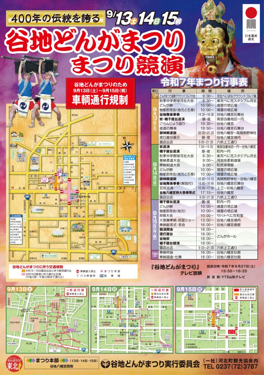 2025年9月13日(土)~15(月・祝)の3日間、河北町谷地地内にて「谷地どんがまつり」が開催されます。