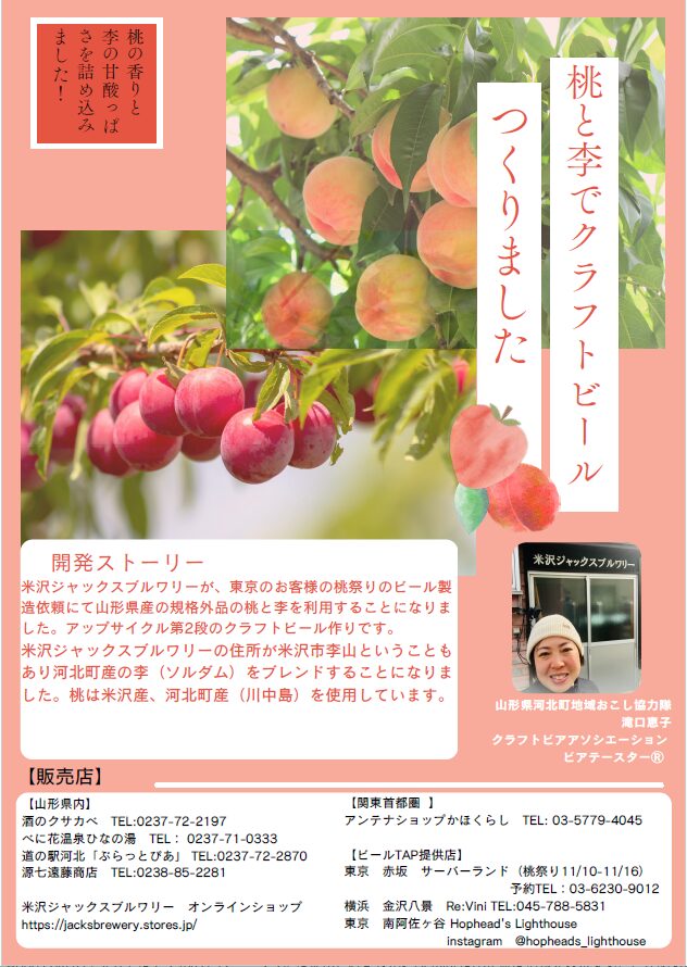 米沢ジャックスブルワリーから、山形県産の規格外品の桃と李を使用したアップサイクル第2弾のビールが、350本の数量限定で販売されています!