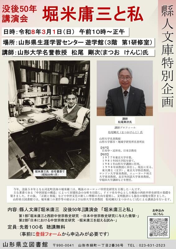 今年没後50年の節目となることから、山形県立図書館「遊学館」にて、山形大学名誉教授の松尾剛次先生よる講演会が開かれます。